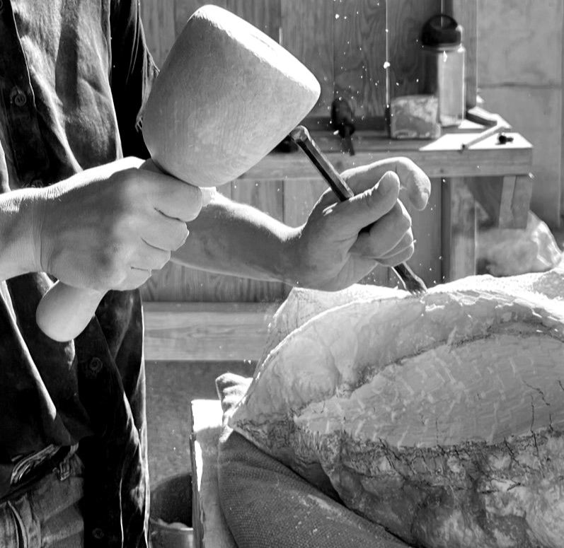 A remarkable mineral and a soft stone, well-suited for shaping with traditional hand tools. I sometimes preserve parts of the raw surface, formed by the earth, while other parts are shaped and polished by tools. Organic forms and a soft tactile quality meet the hardness of the stone. The contrast between smooth and rough textures creates a tactile experience. The material’s translucency subtly yet powerfully influences the expression of the sculpture. The natural veining within the stone presents a challenge, but also invites a playful interaction between nature’s form and the human hand.