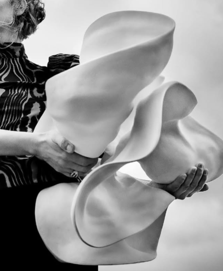 This is where it all began, around twelve years ago, in my living room. This air-drying clay is the material I use to build sculptures in thousands of layers. I then sandblast, file by hand, saw, and build again. [NA1] It’s a long and intuitive process, where I move back and forth, searching for direction in the forms, allowing one shape to give rise to the next. The greatest challenge is finding a way to connect the movement and forms from every angle around the sculpture. Discovering the alignment and flow is the central pursuit of this work..